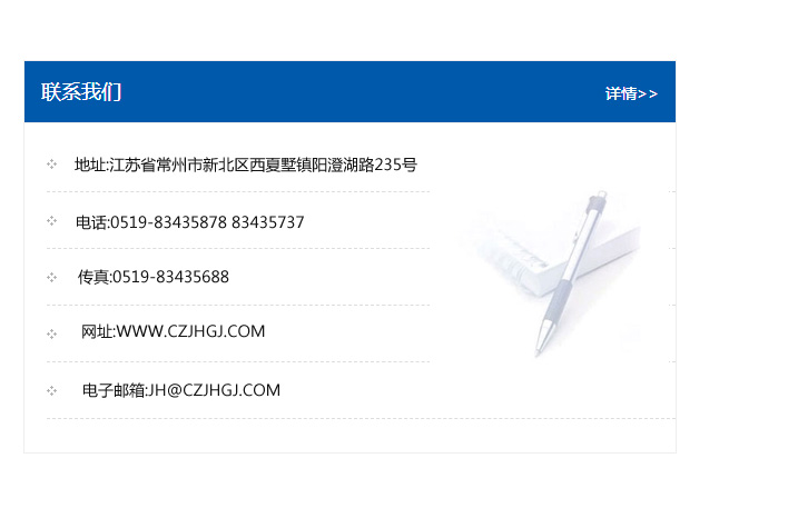 地址:常州市新北區友邦商務大廈1幢16、17層  電話:0519-85101652  傳真:0519-85112595  郵編:213022  網址:www.cz-jiayue_cn.zhongshengqianyuan.com  郵箱:xiajifengaa@163.com